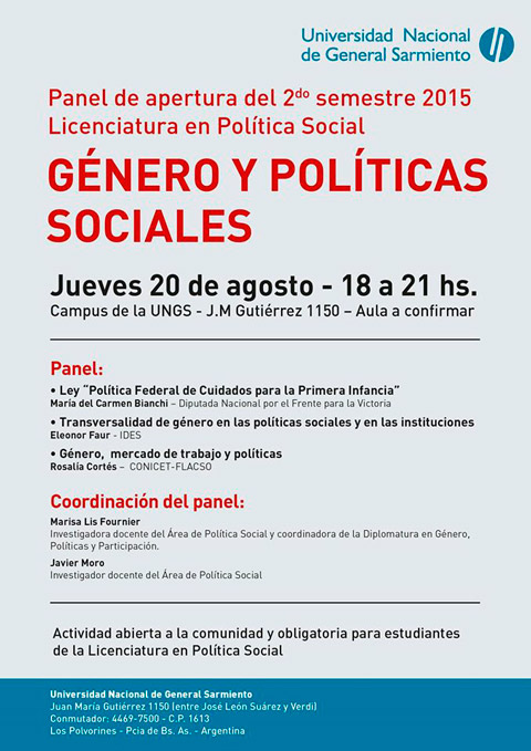 En consonancia con ello la Licenciatura en Política Social de la Universidad Nacional de General Sarmiento invita a un panel de apertura del segundo semestre de 2015 centrado en la discusión sobre GENERO Y POLÍTICAS SOCIALES. Políticas de cuidados para la primera infancia; transversalidad de género en las instituciones y en las políticas; y la relación entre políticas y desigualdad de género en la participación en el mercado de trabajo, serán los temas centrales de la jornada. La actividad es abierta a la comunidad y obligatoria para estudiantes de la Licenciatura en Política Social