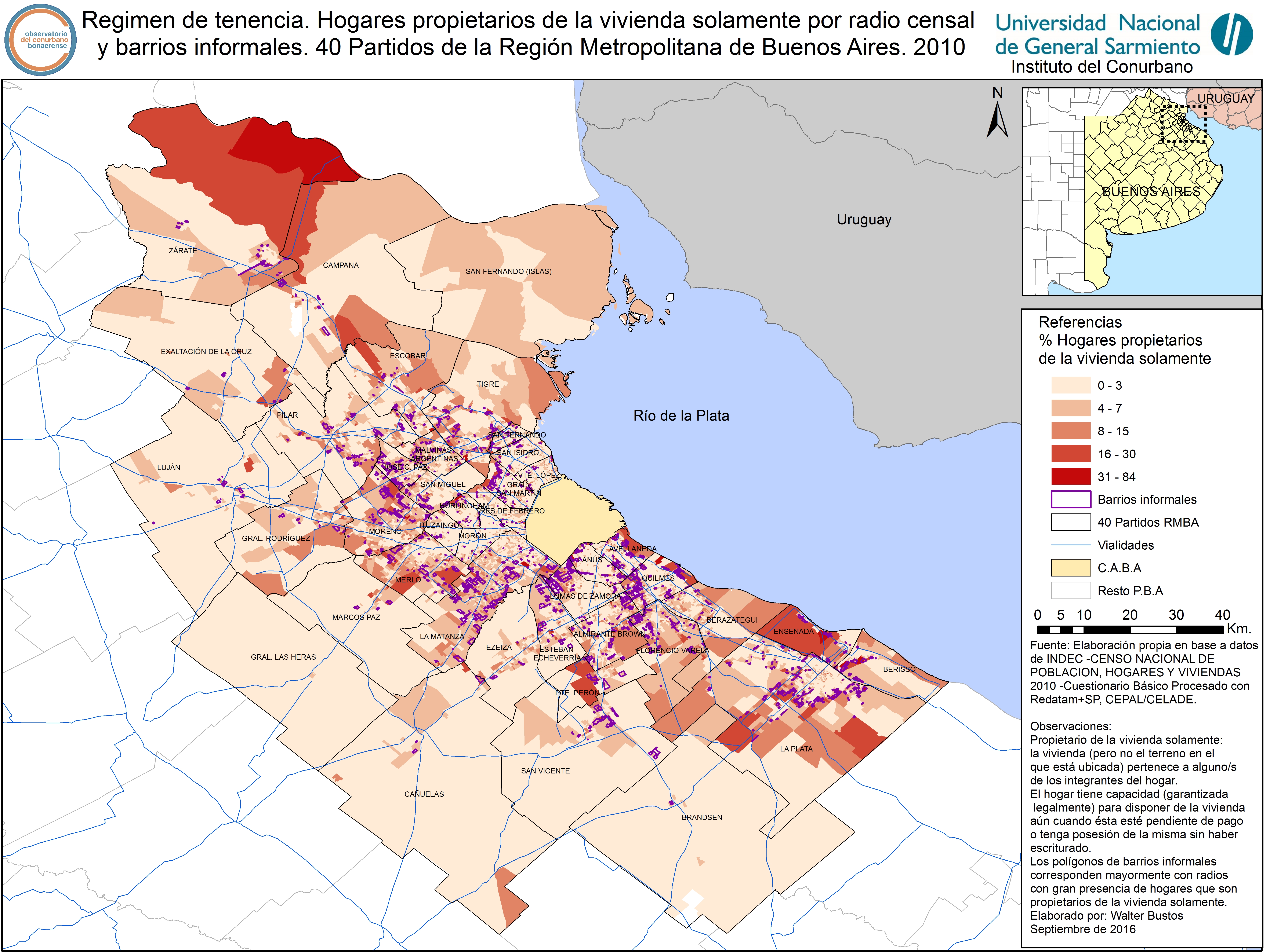 Regimen de tenencia. Hogares propietarios de la vivienda solamente por radio censal y barrios informales. / Mapa