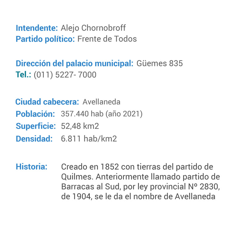 Historia: Creado en 1852 con tierras del partido de Quilmes. Anteriormente llamado partido de Barracas al Sud, por ley provincial n°2830, de 1904, se le da el nombre de Avellaneda.